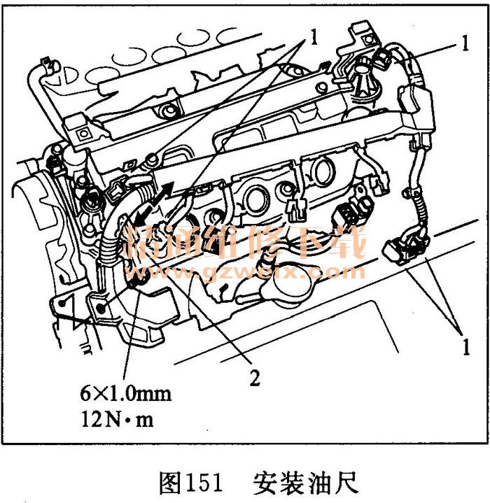 11連接固定線束托架的五個連接器1,并安裝油尺2(見圖151)。