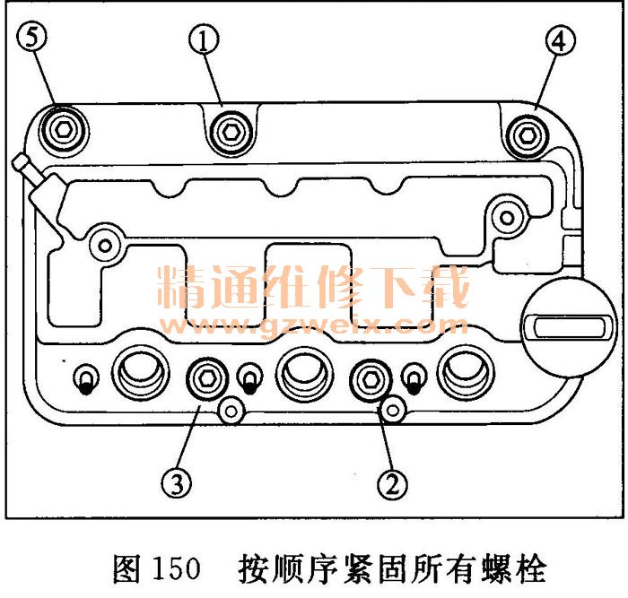 ⑩分三步緊固所有的螺栓。在最后一步中,按順序緊固所有螺栓,力矩為12N·m(1. 2kgf·m)(見圖150)。