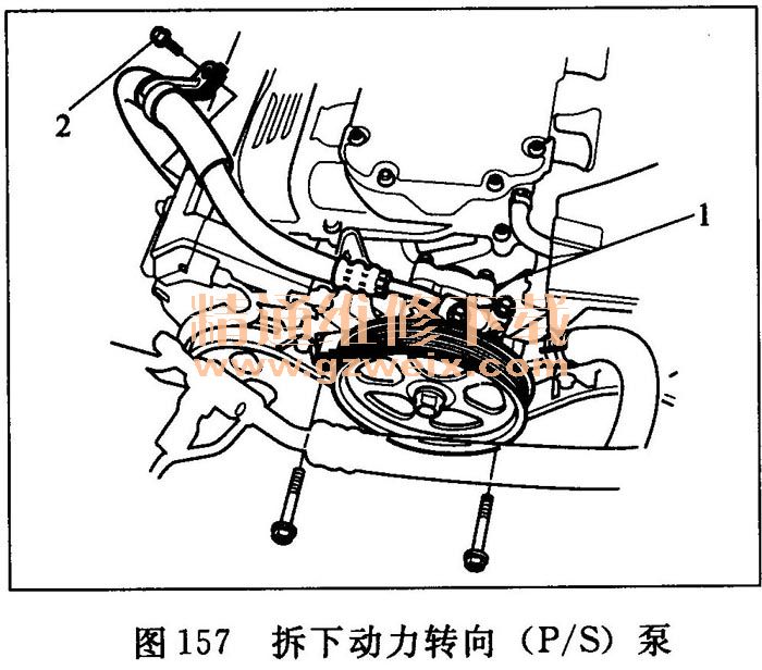 ⑤拆下動力轉(zhuǎn)向(P/S)泵1和固定動力轉(zhuǎn)向軟管托架的螺栓2(見圖157)。