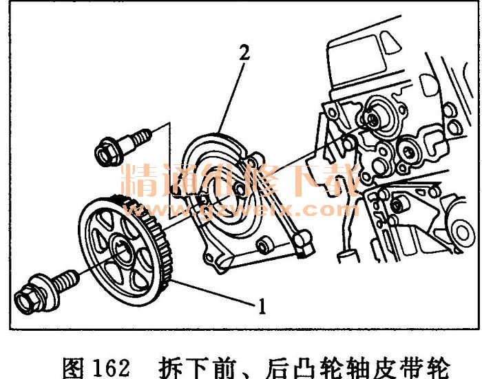 19拆下前、后凸輪軸皮帶輪1和前、后蓋2(見圖162)。