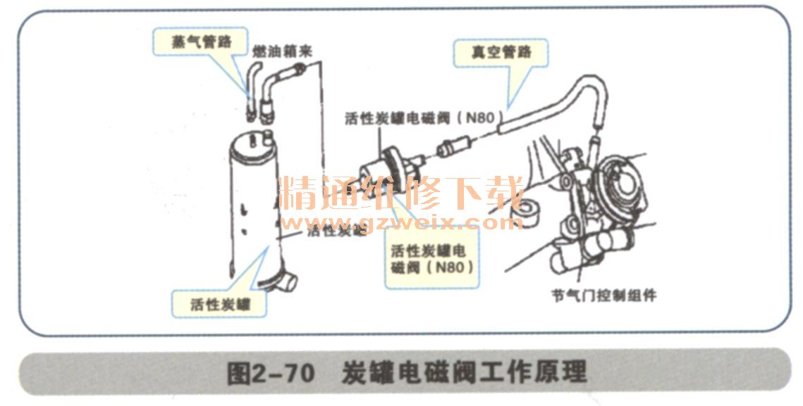 檢測:發(fā)動機暖機怠速運轉(zhuǎn),拔下電磁閥N80前端軟管應(yīng)無吸力,加油門到發(fā)動機轉(zhuǎn)速為2000r/min應(yīng)有吸力。反之檢查電磁閥和電路,如圖2-70所示。