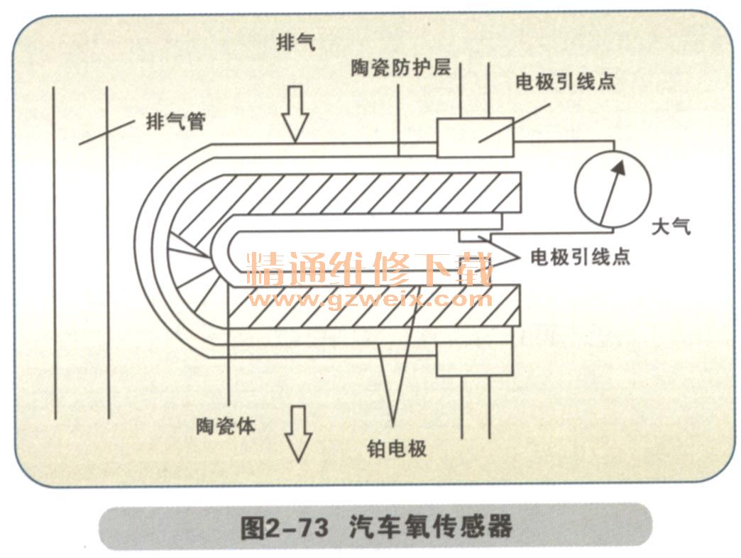 汽車氧傳感器是電噴發(fā)動機控制系統(tǒng)中關(guān)鍵的傳感部件,是控制汽車尾氣排放、降低汽車對環(huán)境污染、提高汽車發(fā)動機燃油燃燒質(zhì)量的關(guān)鍵零件。氧傳感器均安裝在發(fā)動機排氣管上。氧傳感器加熱電阻與氧傳感器為一個整體,因為氧傳感器要在300℃以上工作性能才能良好,所以在剛著車時就會通過電阻加熱盡快讓氧傳感器工作良好。氧傳感器的工作原理與電池相似,傳感器中的氧化錯元素起類似電解液的作用。其基本工作原理是:在一定條件下(高溫和鉑催化),利用氧化錯內(nèi)外兩側(cè)的氧濃度差,產(chǎn)生電位差,且濃度差越大,電位差越大。大氣中氧的含量為21%,濃混合氣燃燒后的廢氣實際上不含氧,稀混合氣燃燒后生成的廢氣或因缺火產(chǎn)生的廢氣中含有較多的氧,但仍比大氣中的氧少得多。在高溫及鉑的催化下,帶負(fù)電的氧離子吸附在氧化錯的內(nèi)外表面上。由于大氣中的氧氣比廢氣中的氧氣多,套管上與大氣相通一側(cè)比廢氣一側(cè)吸附更多的負(fù)離子,兩側(cè)離子的濃度差產(chǎn)生電動勢。當(dāng)套管廢氣一側(cè)的氧濃度低時,在電極之間產(chǎn)生一個高電壓(0.6~1V),這個電壓信號被送到ECU放大處理,ECU把高電壓信號看作濃混合氣,而把低電壓信號看作稀混合氣。根據(jù)氧傳感器電壓信號,電腦按照盡可能接近147 : 1的理論最佳空燃比來稀釋或加濃混合氣。因此,氧傳感器是電子控制燃油計量的關(guān)鍵傳感器。氧傳感器只有在高溫時(端部達到300℃以上)其特征才能充分體現(xiàn),才能輸出電壓,在約800℃時,對混合氣的變化反應(yīng)最快,而在低溫時這種特性會發(fā)生很大變化。