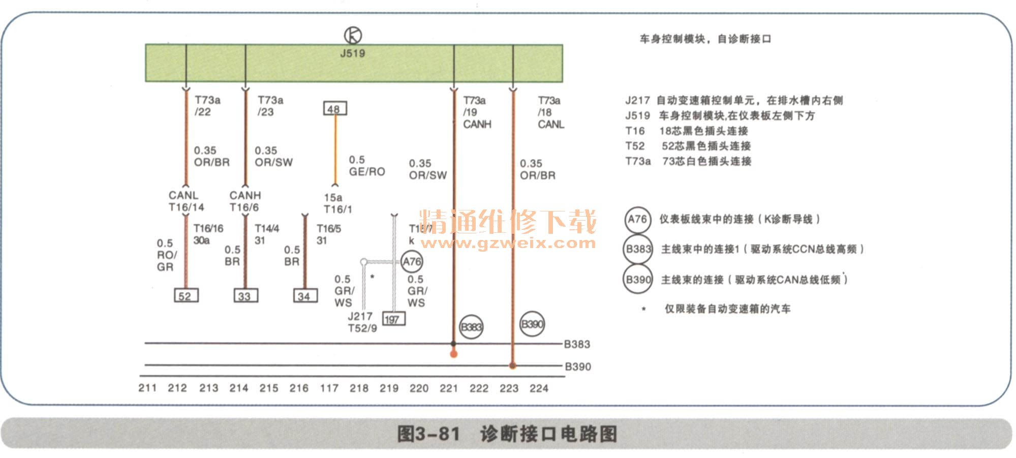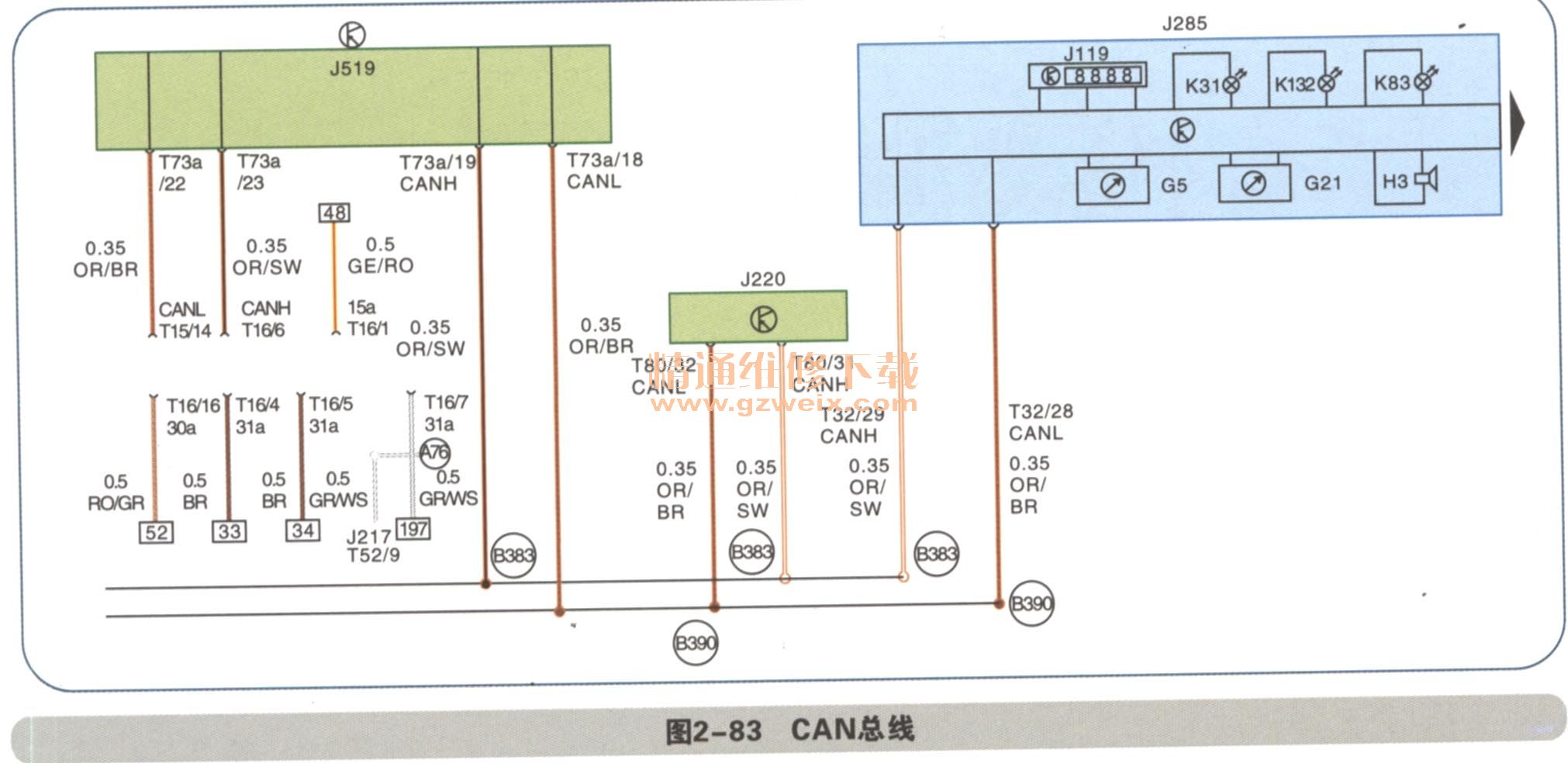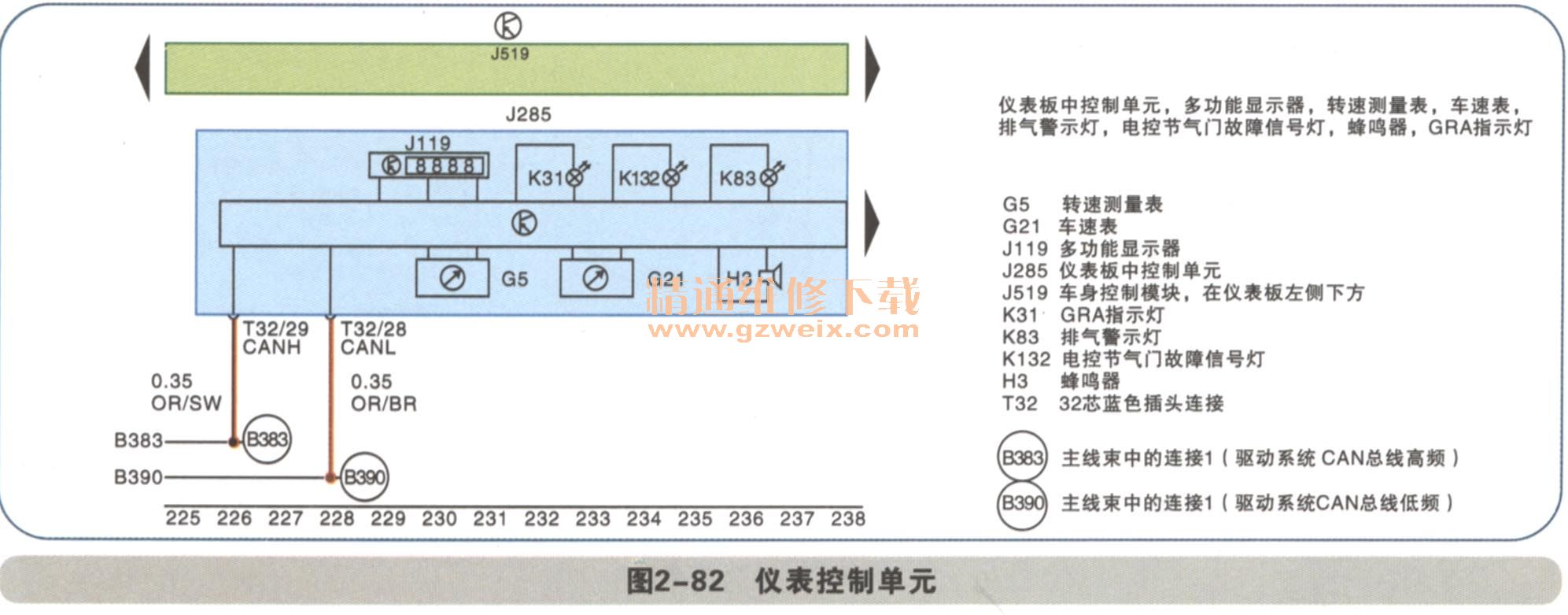 儀表控制單元J285、發(fā)動機控制單元J220、車身控制單元J519都是通過CAN線進行數(shù)據(jù)傳輸如圖2-82、圖2-83所示。