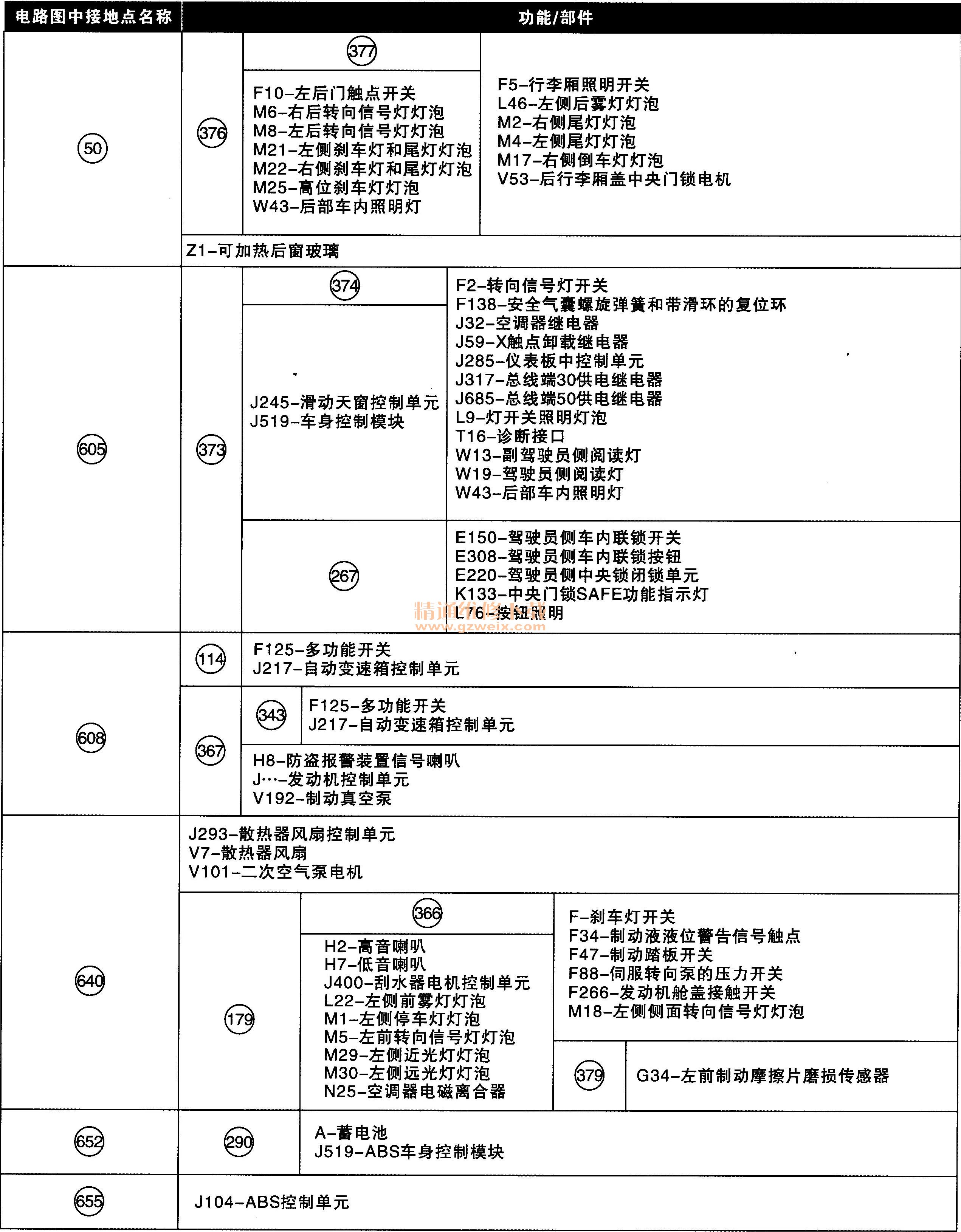 在電路圖中,接地點一般是通過實線直接與某一地址碼連接來表示接地,并在地址碼旁邊用圓圈內(nèi)的數(shù)字來區(qū)分具體接地位置,這部分是直接與車身某處接地的,可參照圖2-22,還有部分接地線是通過連線再到車身某處接地,可參照表2-1。