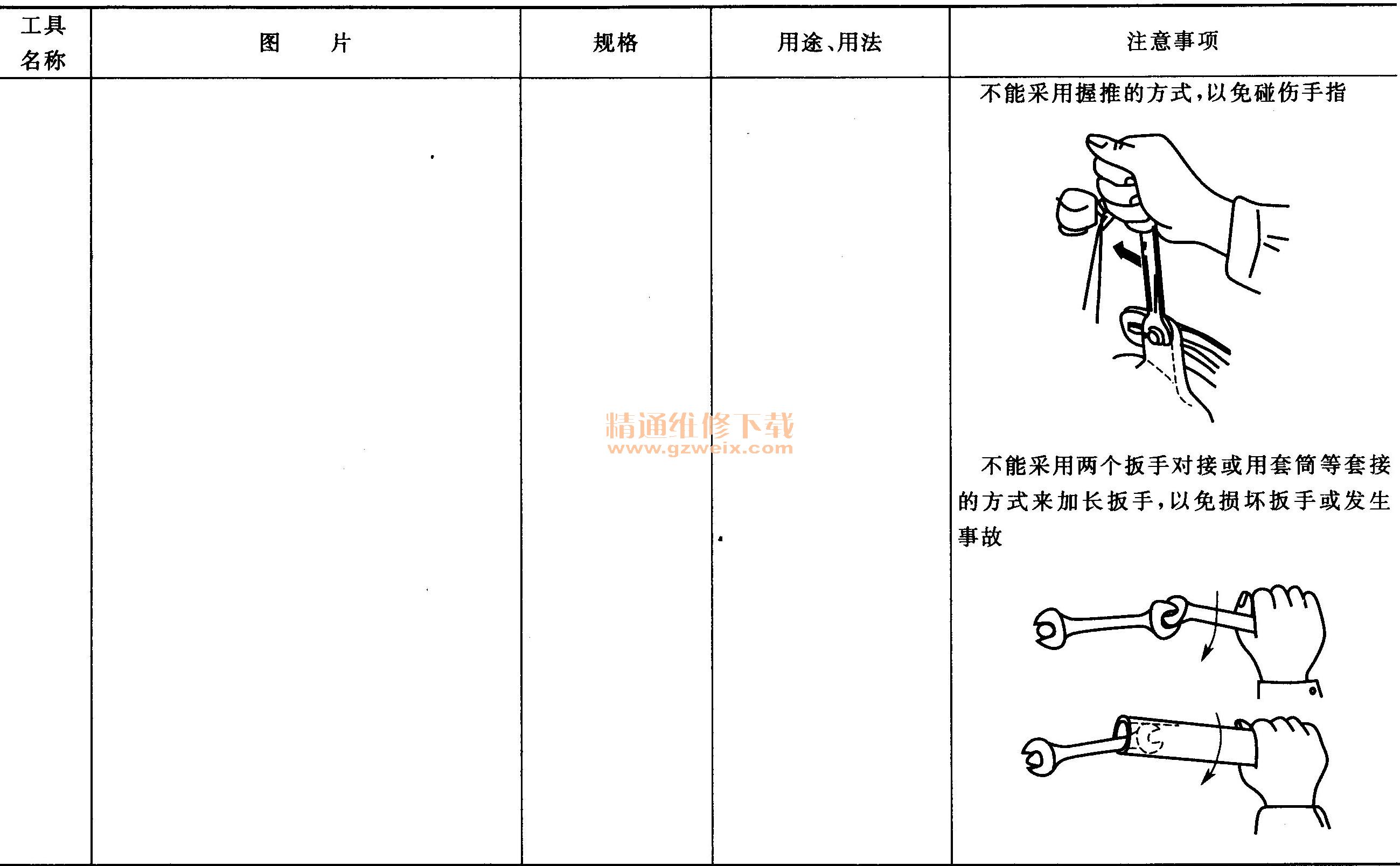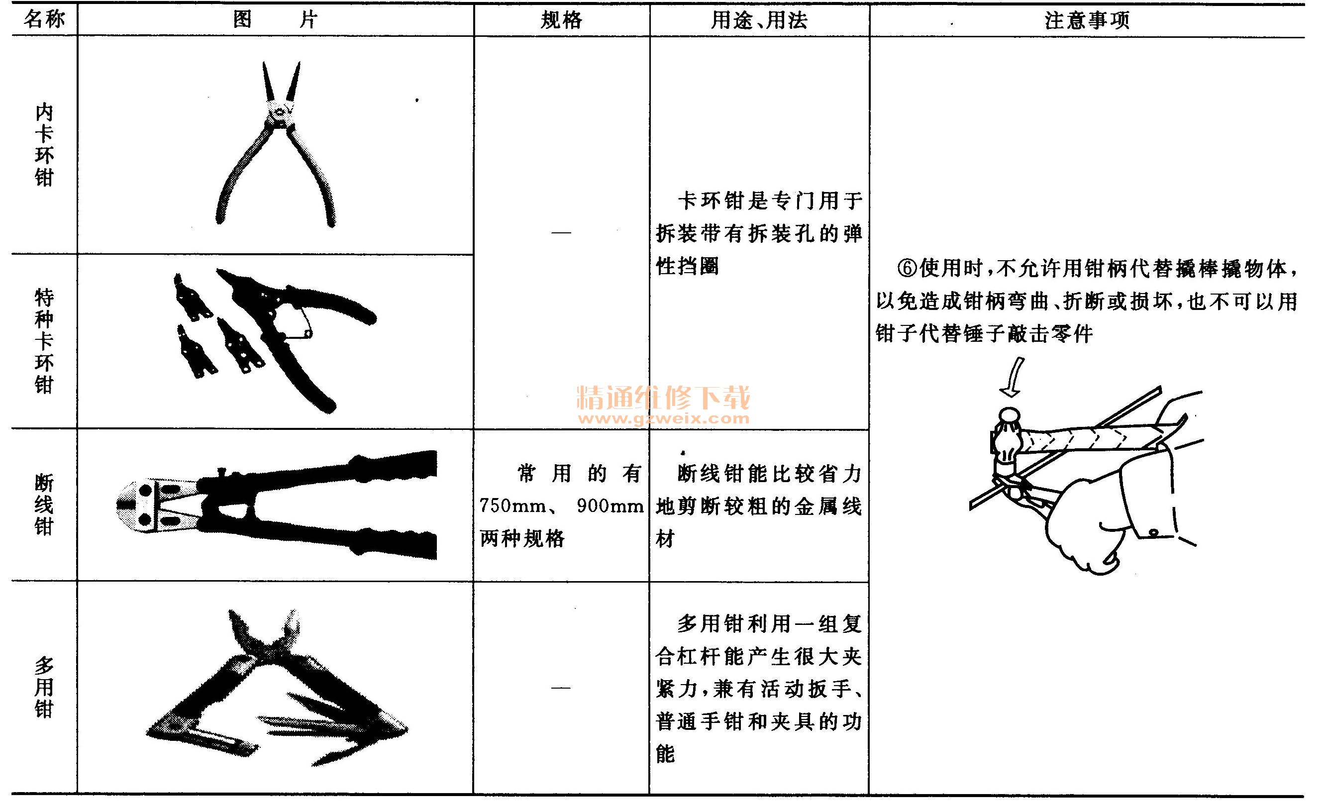 摩托車維修作業(yè)中常用的鉗子有鯉魚鉗、鋼絲鉗、尖嘴鉗和彎嘴鉗、斷線鉗、擋圈鉗和多用鉗等,種類與用途及使用注意事項見表1-1。鉗子的規(guī)格一般以鉗身長度來表示。