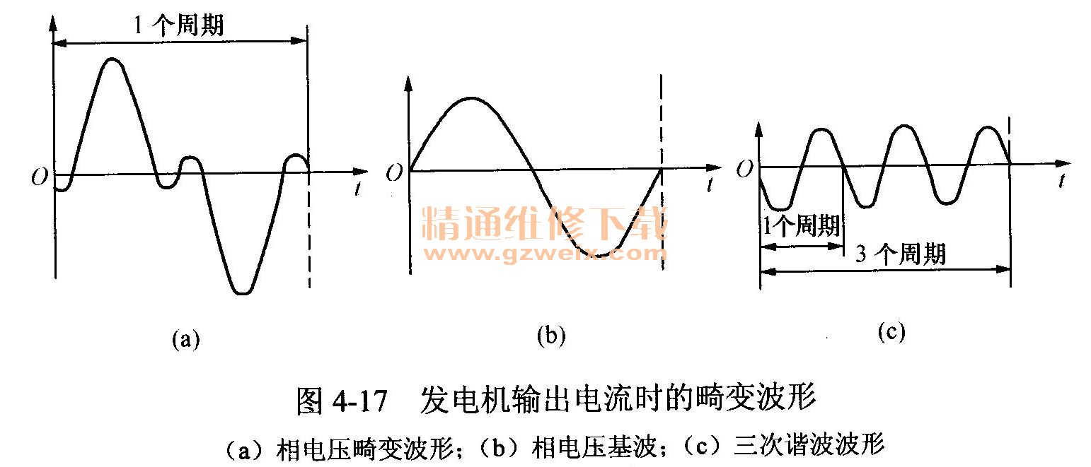 在定子繞組采用Y連接的交流發(fā)電機中,其中性點N不僅具有直流電壓(等于發(fā)電機直流輸出電壓的一半),而且還包含有交流電壓成分。其原因是當交流發(fā)電機空載時,由于鳥嘴形磁極使磁場分布近似為正弦曲線,從而使三相感應電動勢的波形接近于正弦波。而當發(fā)電機正常工作有電須輸出時,由于電樞反應(定子繞組輸出電流產生的磁場對磁場電流產生的磁場影響稱為電樞反應)的強弱、漏磁、鐵磁物質的磁飽和以及整流二極管的非線性特性等因素,將會導致交流發(fā)電機內的磁通分布變?yōu)榉钦曳植迹瑥亩斐山涣靼l(fā)電機感應電動勢和輸出電壓的波形產生畸變,使某一相電壓的實際波形如圖4-17(a)所示。利用數(shù)學方法分析證明,輸出電壓畸變的波形可以認為是由圖4-17(b)所示的正弦基波和圖4-17(c)所示三次諧波(波形頻率為基本頻率3倍的波)疊加而成。