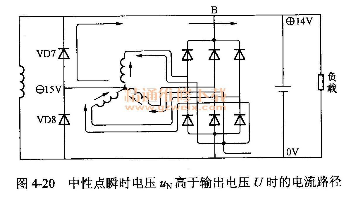 (1)當中性點的瞬時電壓UN高于輸出電壓平均值U時,二極管VD7導通,從中性點輸出的電流如圖4-20中箭頭方向所示。其電路為定子繞組→中性點二極管VD7→輸出端子B→負載和蓄電池→負極管→定子繞組。