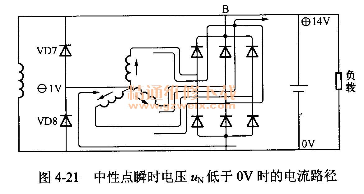 (2)當中性點瞬時電壓UN低于0V(搭鐵電位)時,二極管VD8導通,流過中性點二極管VD8的電流如圖4-21中箭頭方向所示。其電路為定子繞組→正極管→輸出端子B→負載和蓄電池→中性點二極管VD8→定子繞組。