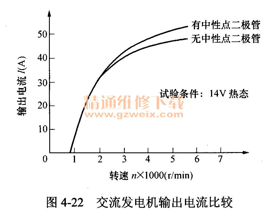 由此可見,只要在中性點處連接兩只整流二極管,就可利用中性點輸出的交流電壓來增加交流發(fā)電機的輸出電流,如圖4-22所示。試驗表明,在不改動交流發(fā)電機結構的情況下,加裝兩只中性點二極管后,當發(fā)電機中高速(發(fā)電機轉速超過2000r/min,發(fā)動機轉速大約超過800r/min)時,其輸出功率與額定功率相比可以提高11%~15%。