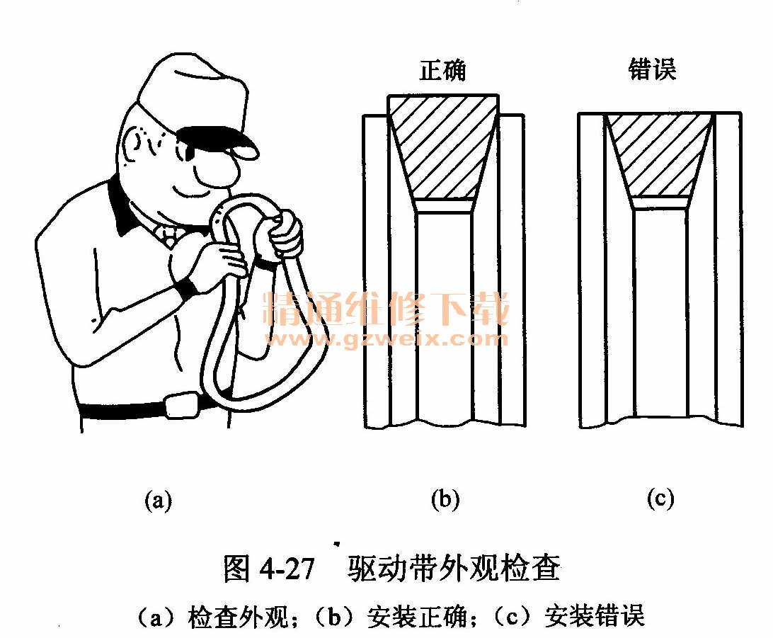 驅動帶外觀檢查如圖4-27所示,用肉眼觀察驅動帶有無裂紋和破損現(xiàn)象,如有則應更換驅動帶。驅動帶安裝情況應當符合圖4-27(b)的要求,如果安裝情況如圖4-27(c)所示,則應更換驅動帶。