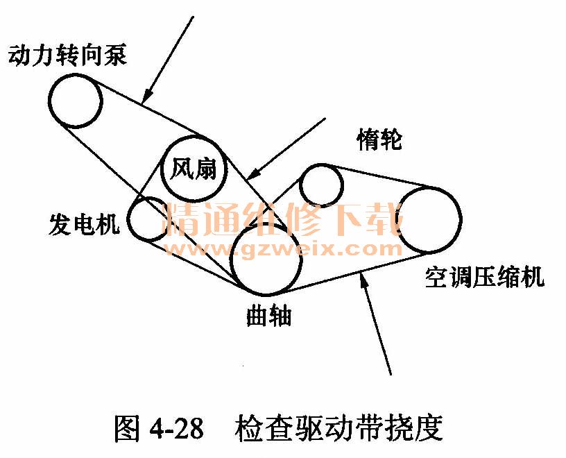 檢查驅動帶撓度的方法如圖4-28所示。檢查時,在兩個驅動帶輪之間驅動帶的中間部位施加100N壓力,此時驅動帶的撓度應符合規(guī)定指標。新驅動帶(即從未用過的驅動帶)一般為5~7mm,舊驅動帶(即裝車隨發(fā)動機轉動過5min或5min以上的驅動帶)一般為10~14mm。具體指標以車型手冊規(guī)定為準,撓度不符合規(guī)定應予以調整。
