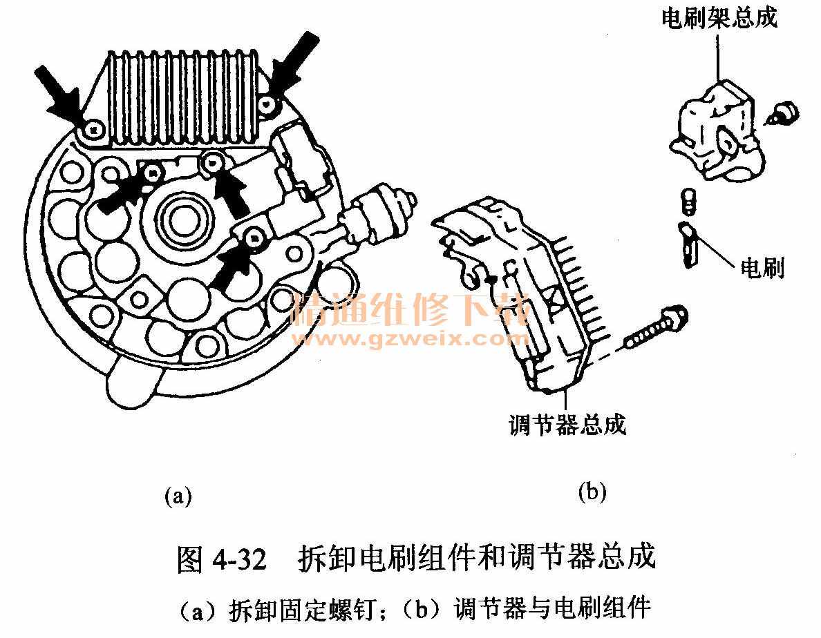 (3)拆下電刷組件的兩個固定螺釘和固定調節(jié)器的3個螺釘,如圖4-32所示,取下電刷組件和集成電路調節(jié)器總成。