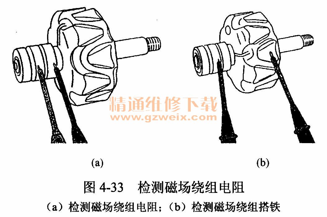 磁場繞組在使用過程中,其端頭的焊點易受震動影響而發(fā)生斷路故障。因此,可用萬用表(指針式撥到RX1擋;數(shù)字式撥到OHM X 200擋)進行檢測,檢測磁場繞組電阻的方法如圖4-33(a)所示。若阻值符合標準數(shù)值(一般為3-50),說明磁場繞組良好;若阻值為無窮大,說明磁場繞組斷路;若阻值小于標準阻值,說明磁場繞組匝間短路。