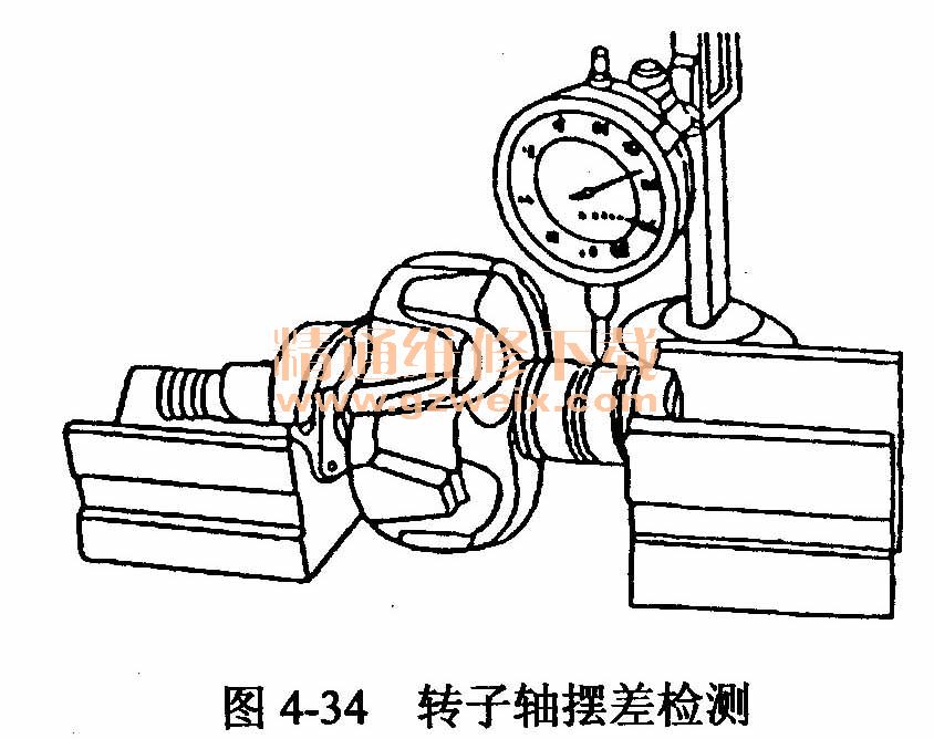 交流發(fā)電機轉子軸的徑向擺差可用百分表檢測,方法如圖4-34所示。其擺差不得超過0.10mm,否則應予以校正。