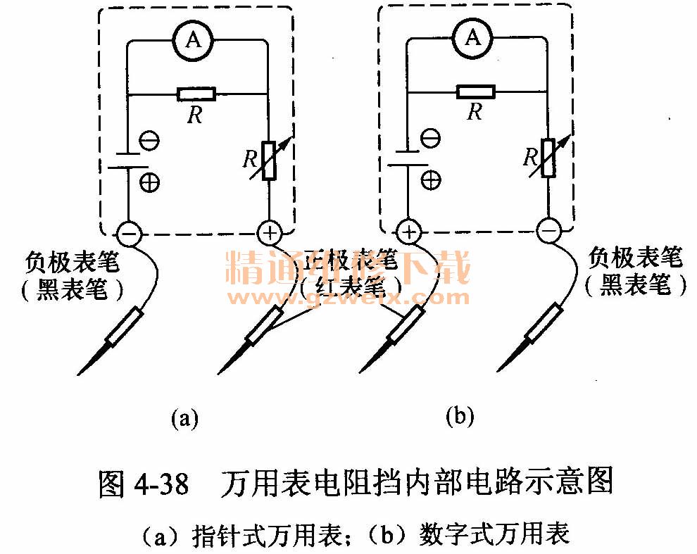 當二極管或整流板總成上無任何標記時,可用萬用表檢測判別其極性。常用的萬用表有指針式和數(shù)字式兩種,其電阻擋的內部原理電路如圖4-38所示,由圖可見,指針式萬用表的正極(紅色表筆或正測試棒)接表內電源負極,而數(shù)字式萬用表的正極(紅色表筆或正測試棒)接表內電源正極。這一點應特別注意,否則二極管極性的判斷結果正好相反。下面以指針式萬用表檢測為例,說明其檢測方法。