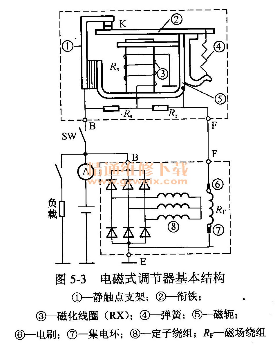 觸點(diǎn)組件由觸點(diǎn)K、靜觸點(diǎn)支架①、銜鐵②和彈簧④組成。靜觸點(diǎn)固定在支架①上,動(dòng)觸點(diǎn)固定在銜鐵②的一端;銜鐵的另一端支承在磁扼⑤上,可繞支點(diǎn)轉(zhuǎn)動(dòng)微小角度。彈簧④一端掛在銜鐵端部,另一端掛在支架上。觸點(diǎn)K串聯(lián)在發(fā)電機(jī)磁場(chǎng)電路中,當(dāng)調(diào)節(jié)器不工作時(shí),觸點(diǎn)在彈簧拉力作用下保持閉合狀態(tài)。調(diào)節(jié)電阻Rr與觸點(diǎn)K并聯(lián)。