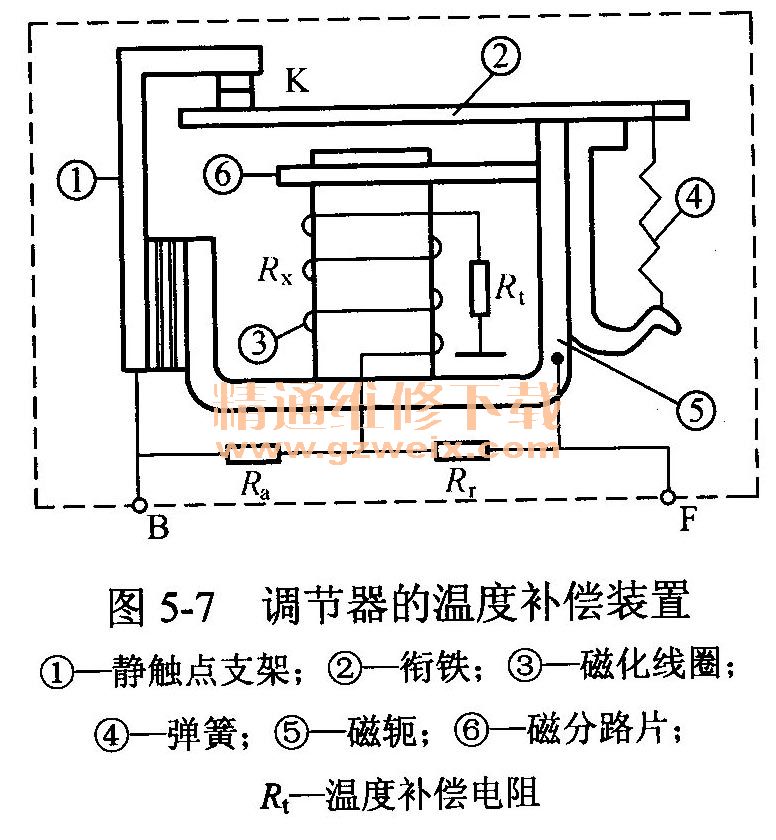 磁化線圈在鐵芯中產(chǎn)生的磁通分為兩路:一路經(jīng)氣隙、銜鐵②和磁轆⑤回到鐵芯,這部分磁通越多,吸引銜鐵的力矩越大;另一路磁通經(jīng)磁分路片⑥和磁轆⑤回到鐵芯。當(dāng)溫度升高時(shí),雖然磁化線圈電阻增大、電流減小會(huì)使磁通減少,但是,溫度升高又使磁分路片的磁阻增大,通過磁分路片的磁通減少,使通過氣隙和銜鐵的磁通相對(duì)增多,從而彌補(bǔ)線圈電流減小帶來的影響;當(dāng)溫度降低時(shí),磁分路片的作用與上述相反,從而便使發(fā)電機(jī)輸出電壓不隨溫度變化而變化。