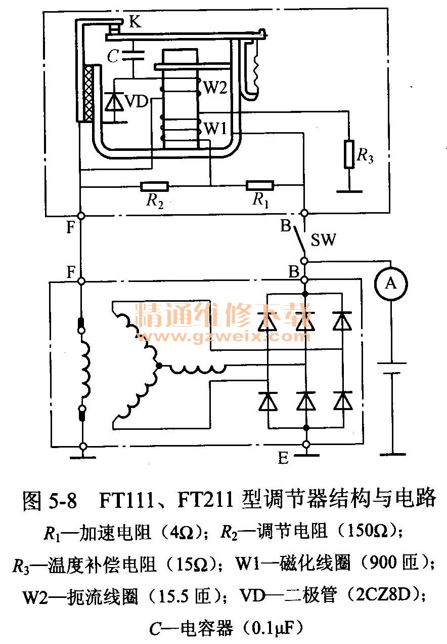 FT111、FT211型調(diào)節(jié)器是上海實(shí)業(yè)交通電器有限公司生產(chǎn)的一種具有滅弧系統(tǒng)的單級(jí)電磁式調(diào)節(jié)器,它能有效克服普通單級(jí)電磁式調(diào)節(jié)器觸點(diǎn)易產(chǎn)生火花而迅速燒蝕的缺點(diǎn),F(xiàn)T111型適用于12V, 300~500W內(nèi)搭鐵型交流發(fā)電機(jī),F(xiàn)T211型適用于24V,300~500W內(nèi)搭鐵型交流發(fā)電機(jī)。兩種型號(hào)調(diào)節(jié)器的結(jié)構(gòu)與電路基本相同,如圖5-8所示。由圖可見,兩種調(diào)節(jié)器在單級(jí)電磁式調(diào)節(jié)器的基礎(chǔ)上,增加一個(gè)由二極管VD、扼流線圈W2和電容C組成的VD-L-C觸點(diǎn)滅弧系統(tǒng)。