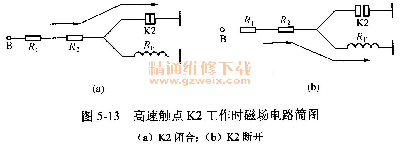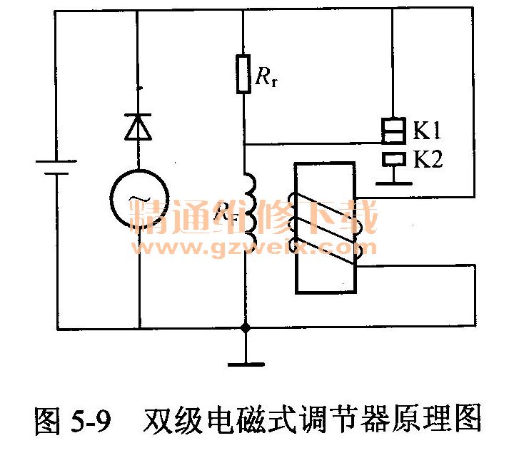在交流發(fā)電機(jī)高速或小負(fù)荷時(shí),由二級(jí)觸點(diǎn)或高速觸點(diǎn)K2工作,通過短路磁場(chǎng)繞組,使磁場(chǎng)電流變化來控制發(fā)電機(jī)電壓。