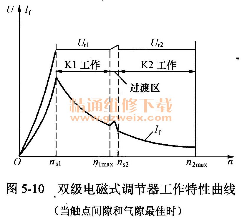 雙級(jí)電磁式調(diào)節(jié)器的工作特性如圖5-10所示。圖中ns1~n1max為第一級(jí)低速觸點(diǎn)K1工作時(shí)的調(diào)節(jié)范圍,nS2~n2max為第二級(jí)高速觸點(diǎn)K2工作時(shí)的調(diào)節(jié)范圍。調(diào)節(jié)器觸點(diǎn)從第一級(jí)過渡到第二級(jí)工作時(shí),由于彈簧拉力以及銜鐵之間的空氣隙發(fā)生變化,所以兩級(jí)調(diào)節(jié)電壓的平均值也略有不同,出現(xiàn)一個(gè)級(jí)差△U。