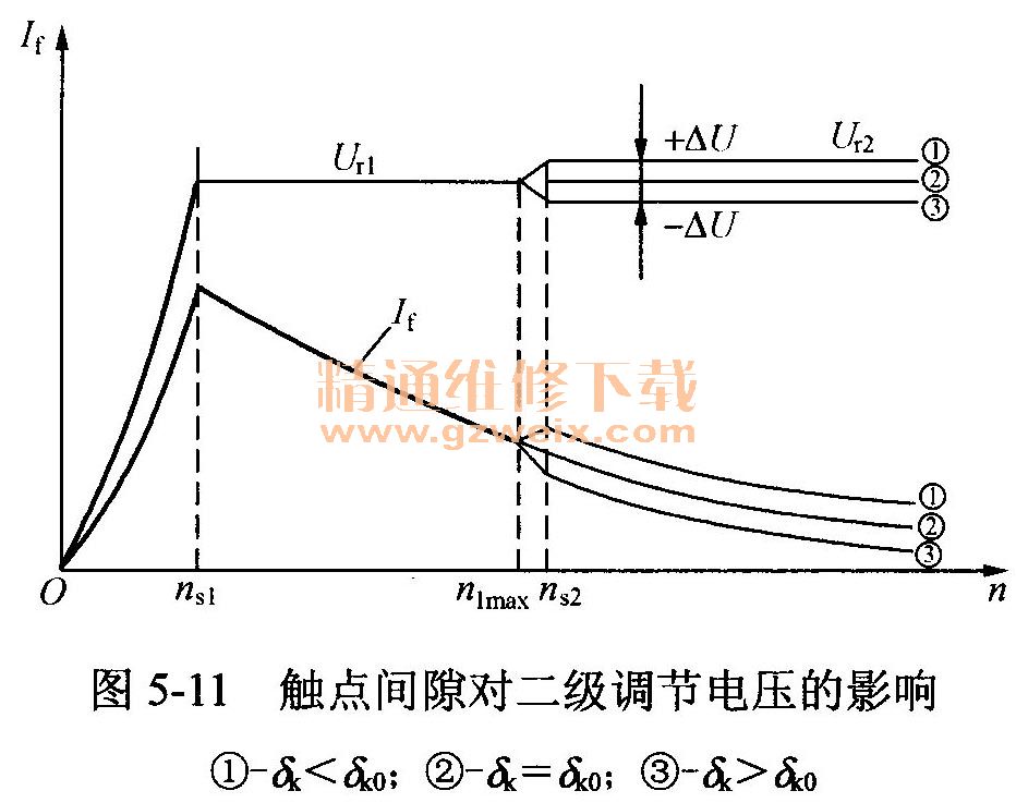 而在氣隙不變的情況下,當(dāng)觸點(diǎn)間隙戊小于最佳間隙δk0(約0.25mm)時(shí),二級(jí)調(diào)節(jié)電壓Ur2將高于一級(jí)調(diào)節(jié)電壓Ur1,即為正級(jí)差,如曲線①所示;當(dāng)觸點(diǎn)間隙δk大于最佳觸點(diǎn)間隙δk0時(shí),二級(jí)調(diào)節(jié)電壓Ur2將低于一級(jí)調(diào)節(jié)電壓Ur1,即為負(fù)級(jí)差,如曲線③所示。這是因?yàn)樵诟咚儆|點(diǎn)間隙增大的情況下,當(dāng)其閉合時(shí)彈簧伸長(zhǎng),拉力增加。彈簧拉力與伸長(zhǎng)距離成正比增大,但與此同時(shí)銜鐵與鐵芯間的氣隙減少,而鐵芯的電磁吸力是按拋物線規(guī)律增加的緣故。