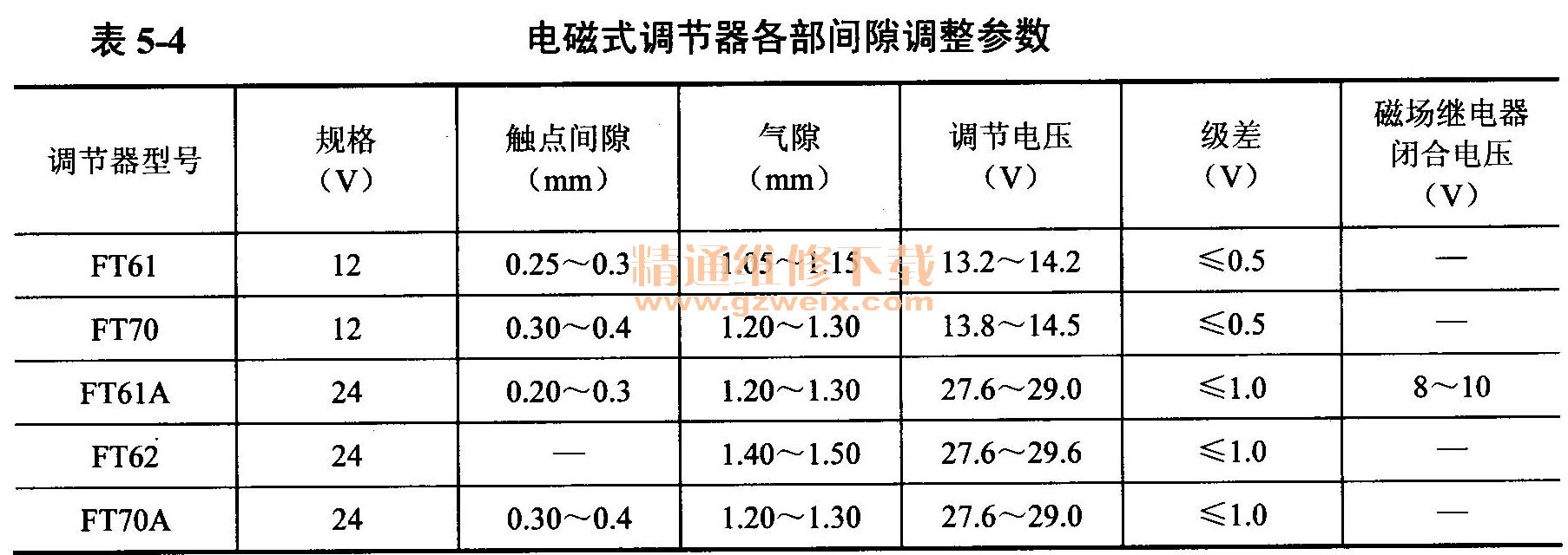電磁式調(diào)節(jié)器的間隙有高速觸點(diǎn)間隙、銜鐵與鐵芯間的氣隙。常用電磁式調(diào)節(jié)器各部間隙的調(diào)整參數(shù)見(jiàn)表5-4。