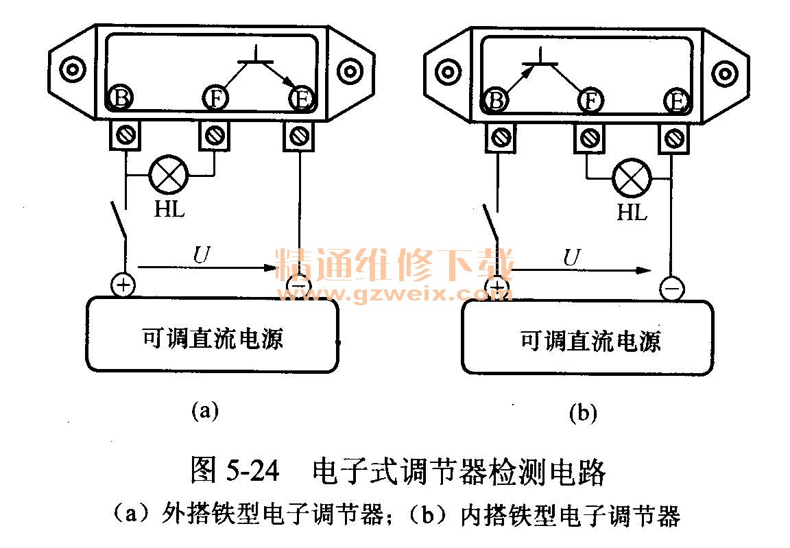 當(dāng)不知電子調(diào)節(jié)器的搭鐵形式時(shí),可按圖5-24(a)所示線路進(jìn)行檢測(cè),具體方法與步驟如下: