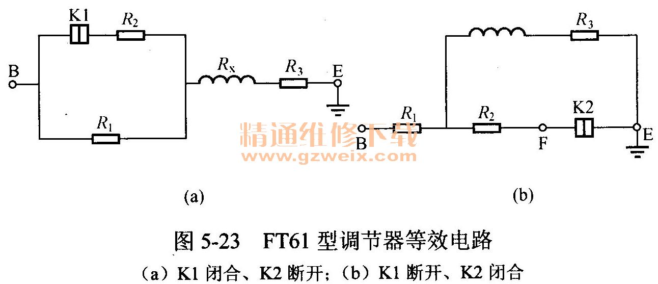 當(dāng)?shù)退儆|點(diǎn)K1閉合、高速觸點(diǎn)K2斷開(kāi)時(shí),調(diào)節(jié)器的等效電路如圖5-23(a)所示,RBE應(yīng)為23.4Ω,即