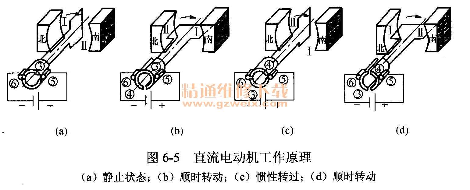 當(dāng)線圈旋轉(zhuǎn)到圖6-5(c)所示垂直的位置時(shí),電刷⑤、⑥又不與換向片③、④接觸,線圈中又無電流流過,但是,此時(shí)線圈將以其轉(zhuǎn)動慣性轉(zhuǎn)過此位置。