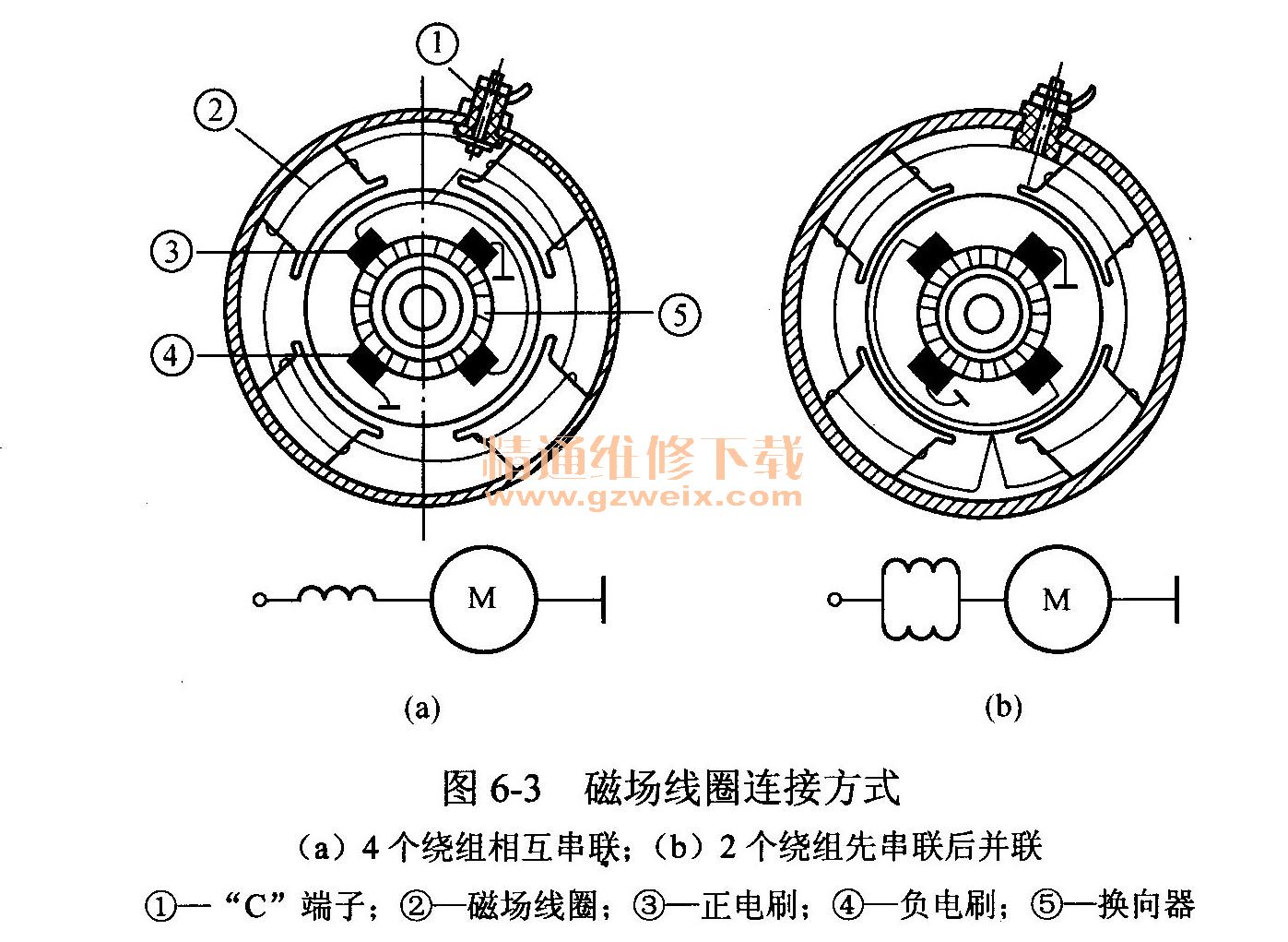 直流電動機(jī)磁極的功能是產(chǎn)生磁場,磁極由鐵芯和磁場線圈組成,鐵芯用低碳鋼制成馬蹄形,并用螺釘固定在電動機(jī)殼體的內(nèi)壁上,磁場線圈套裝在鐵芯上。為了增大起動機(jī)的電磁轉(zhuǎn)矩,一般采用四個(gè)磁極,功率超過7.35kW的起動機(jī)有的采用6個(gè)磁極。磁場線圈用矩形裸體銅線(QD 124型起動機(jī)為1.25×6.OMM2矩形銅線;QD321型起動機(jī)為1.25×5.5mm2矩形銅線)繞制,并與電樞繞組串聯(lián),如圖6-3所示。4個(gè)磁場線圈的連接方式有兩種:一種是4個(gè)繞組串聯(lián)后再與電樞繞組串聯(lián),如圖6-3(a)所示;另一種是兩個(gè)繞組先串聯(lián)后并聯(lián),然后再與電樞繞組串聯(lián),如圖6-3(b)所示,目前普遍采用后一種連接方式。無論采用哪一種連接方式,其磁場線圈通電產(chǎn)生的磁極必須N、S極相間排列。