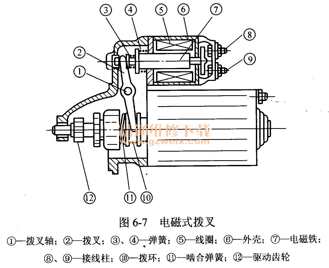 拔叉的作用是使離合器做軸向移動,使驅(qū)動嚙入或脫離飛輪齒環(huán)。現(xiàn)代汽車一般采用電磁式撥叉,如圖6-7所示。它用外殼封裝于起動機(jī)殼體上,有可動和靜止兩部分組成。可動部分包括撥叉和電磁鐵芯,兩者之間用螺桿活的連接。靜止部分包括繞在電磁鐵芯鋼套外的線圈、撥叉軸和復(fù)位彈簧。