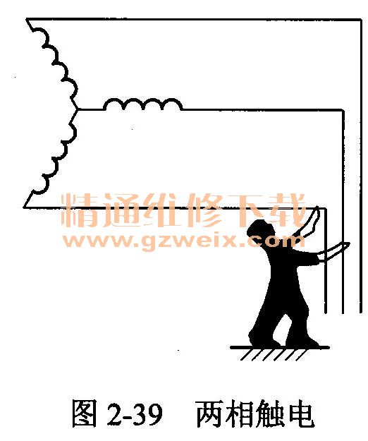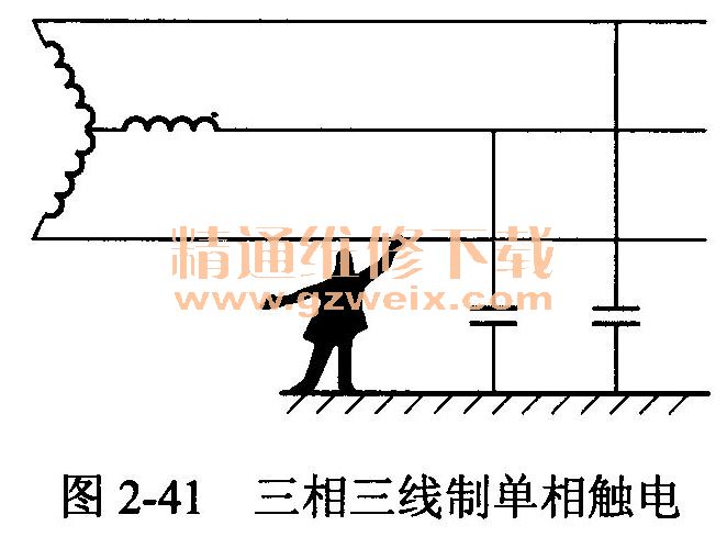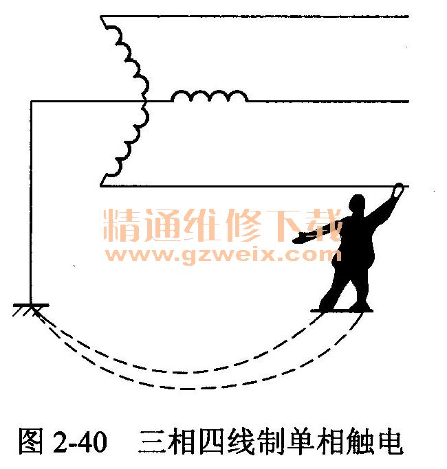 (1)三相四線制單相觸電。如圖2-40所示,人體的一個部位接觸一根相線,另一部位接觸大地,這樣,人體、大地、中線、一相電源繞組就形成回路。人體承受相電壓,構成了三相四線制單相觸電。