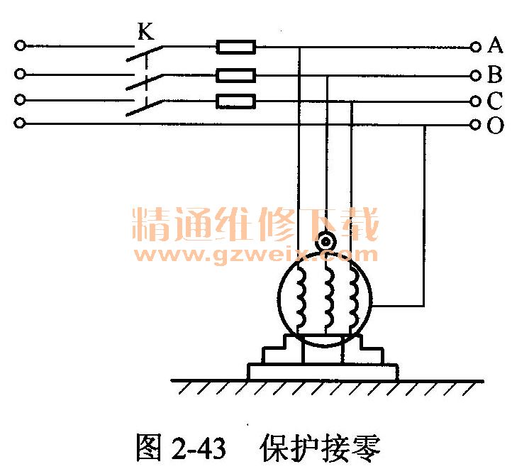 圖2-43為保護接零示意圖,當某相繞組與機殼短路時,因有接零保護使該相電源短接,電流很快燒斷該相熔絲而斷電。