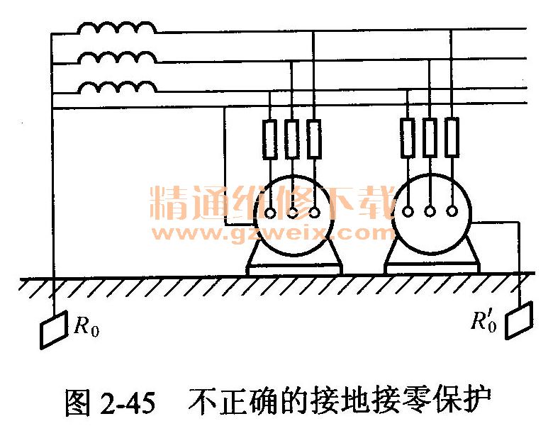(1)同一電源上的電氣設備不可一部分設備接零,另一部分接地。因為當接地的電氣設備絕緣損壞而碰殼時,可能由于大地的電阻較大使保護開關或保護熔絲不能動作,于是電源中性點電位升高(等于接地短路電流乘以中點接地電阻),以致使所有的接零電氣設備都帶電(見圖2-45)反而增加了觸電的危險性。