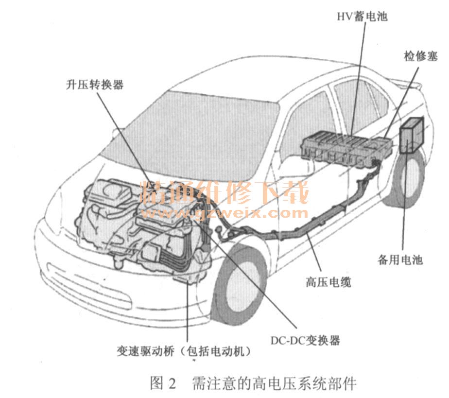 由于車內(nèi)有500V的電氣零件和電路、高堿性的HV蓄電池電解液(氫氧化鉀),因此,在維修普銳斯車輛時,如果操作方法不當或工作中疏忽大意,都有可能造成嚴重電擊或身體被傷害的潛在危險。