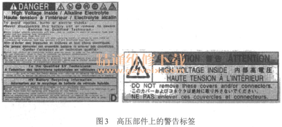 在HV電池和變頻器上,貼有警告標簽如圖3所示,它們提供了基本的使用警告、操作說明和回收信息。