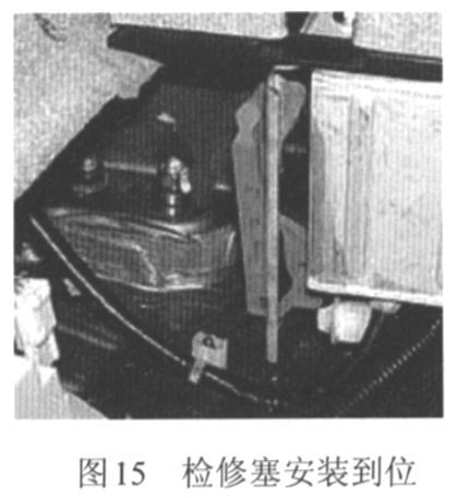 車輛維修完畢后,需要將檢修塞重新裝入,裝入安裝檢修塞時務必戴上絕緣手套以防止遭到電擊。如果檢修塞沒有完全鎖好(沒有聽到“咔嚓”一聲),主警告燈點亮,同時混合系統(tǒng)警告燈點亮,診斷故障代碼(檢修塞互鎖開關)將被存儲在ECU存儲器內(nèi)。檢修塞的裝入分為三個步驟:首先將檢修塞放入到安裝孔中,如圖13所示;然后轉(zhuǎn)動檢修塞桿,如圖14所示;向下推塞桿直到聽到“咔嚓”一聲,即安裝到位,如圖15所示。