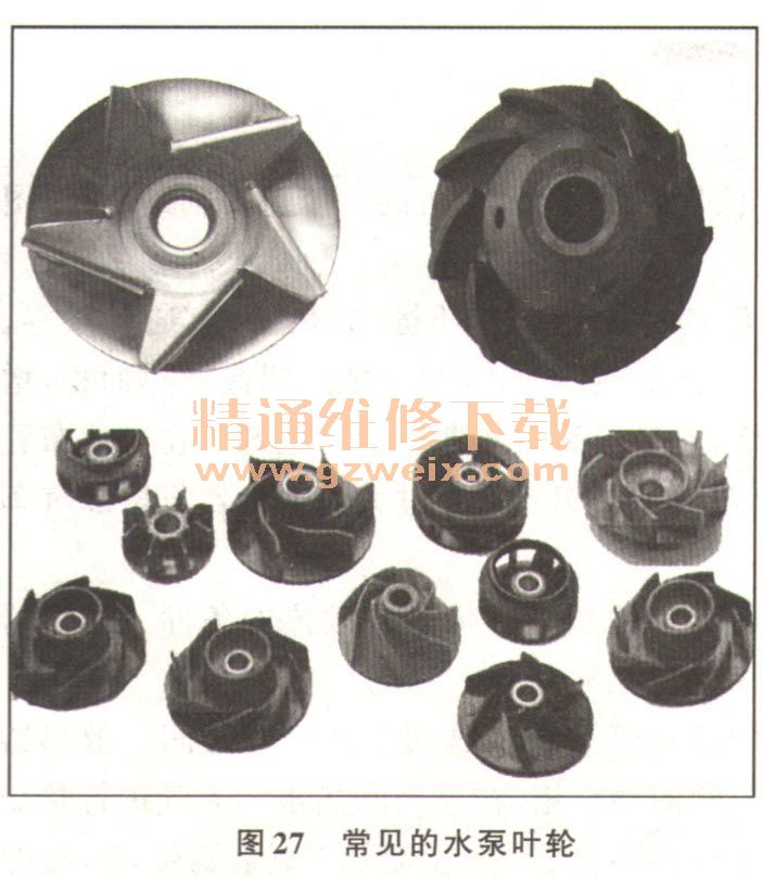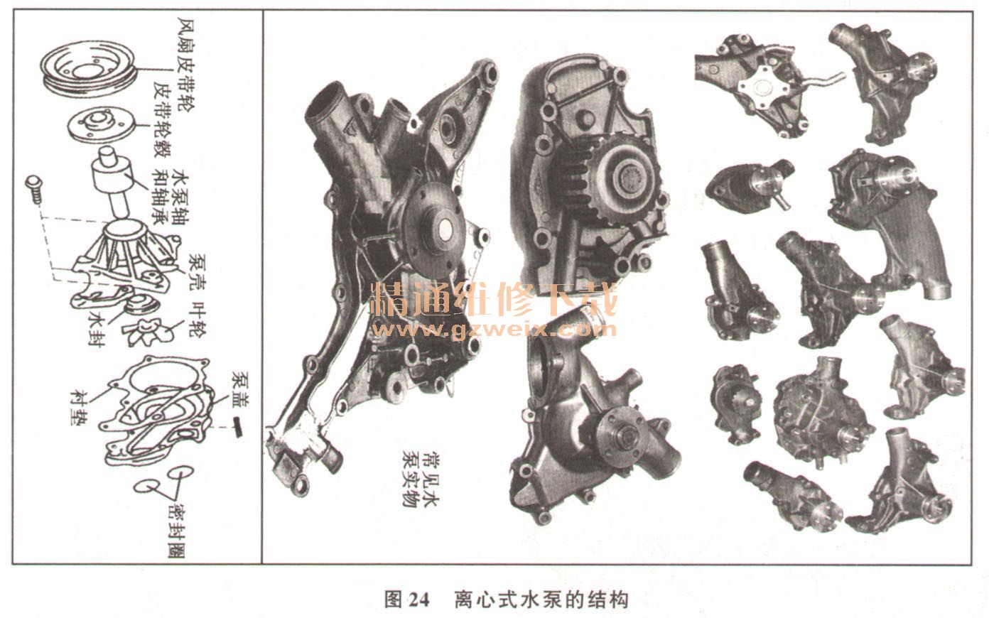 汽車發(fā)動(dòng)機(jī)廣泛采用離心式水泵,它具有結(jié)構(gòu)緊湊、泵水量大等優(yōu)點(diǎn),而且因故障而停止工作時(shí),不妨礙水在冷卻系內(nèi)部自然循環(huán)。離心式水泵的結(jié)構(gòu)組成如圖24所示。