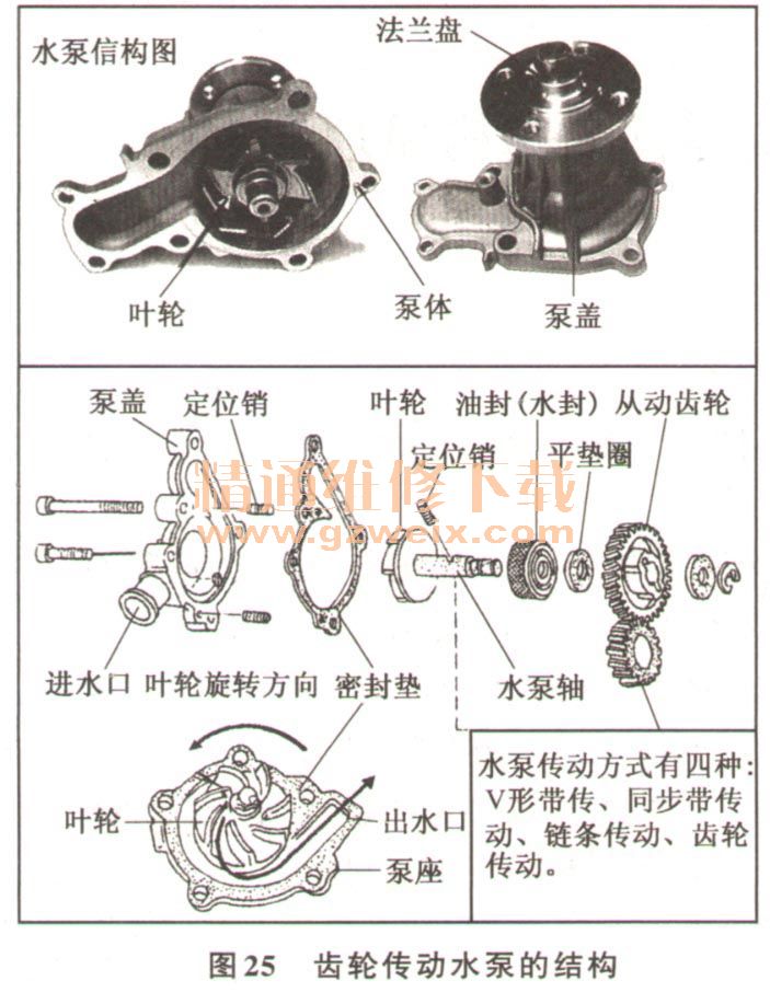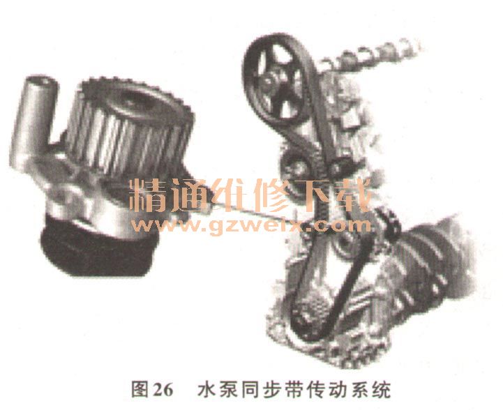 水泵的傳動(dòng)方式有非同步帶傳動(dòng)、同步帶傳動(dòng)、鏈條傳動(dòng)和齒輪傳動(dòng)幾種。圖25所示為齒輪傳動(dòng)的水泵系統(tǒng),圖26所示為同步帶傳動(dòng),水泵主要由葉輪、泵軸、水封及油封、密封墊、泵蓋、軸承、泵座組成。如圖27、圖28所示的常見的水泵葉輪、軸承、泵軸的結(jié)構(gòu)。