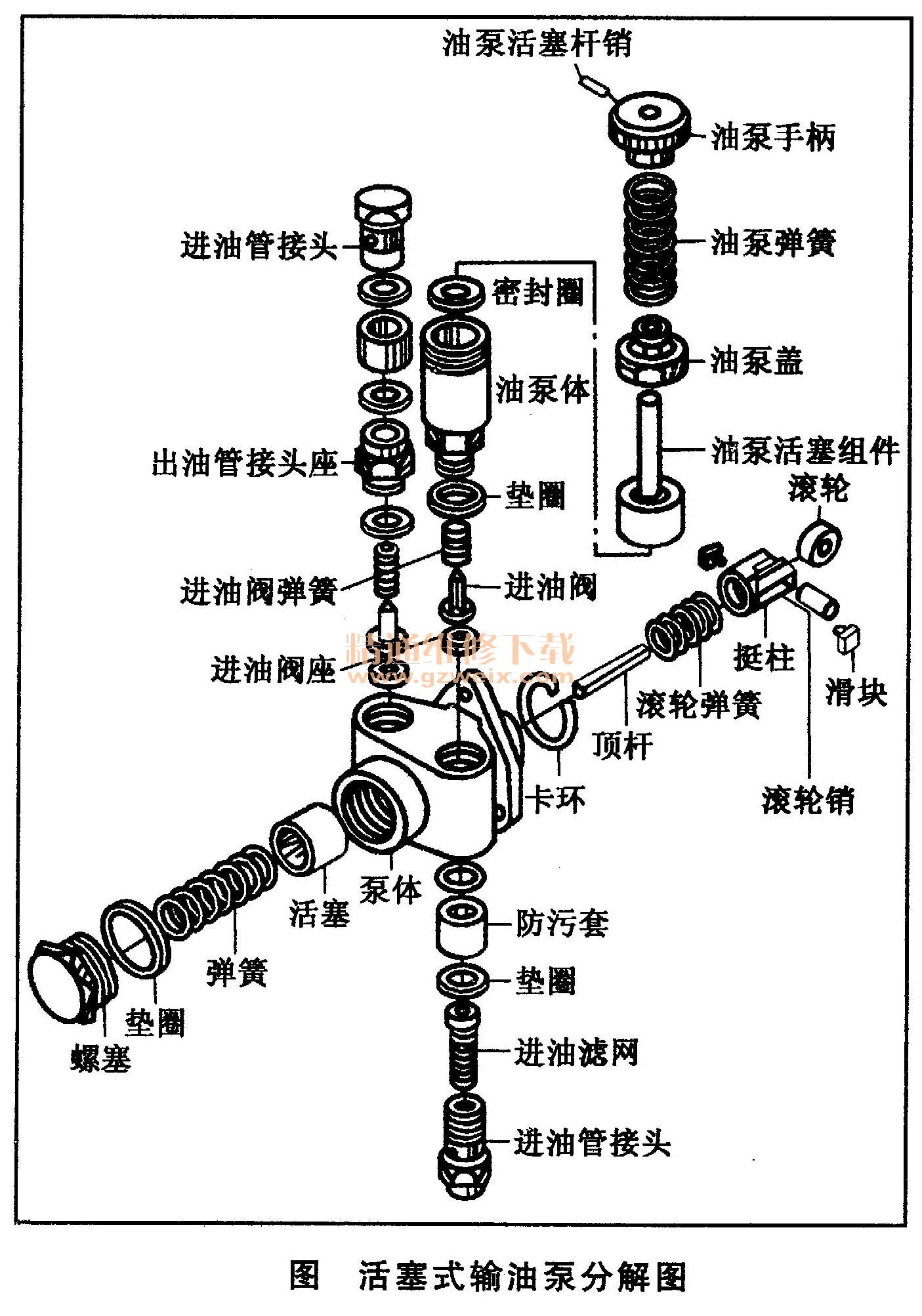 (4)拆下輸油泵蓋,取出輸油泵活塞組件。