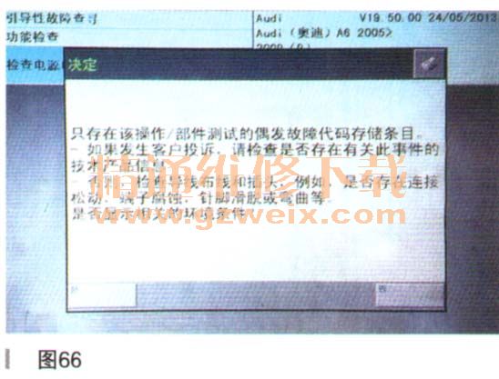 診斷儀提示檢查相關(guān)插接器和導(dǎo)線是否存在故障,根據(jù)檢查結(jié)果選擇相應(yīng)選項并點擊下一步,如圖66所示。