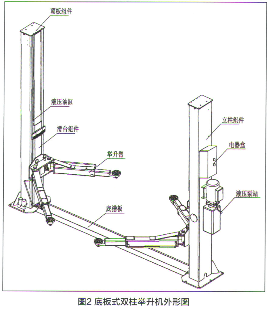 液壓傳動雙柱舉升機(jī),按結(jié)構(gòu)布置主要分為龍門式雙柱舉升機(jī)和底板式雙柱舉升機(jī)(圖1、圖2)。液壓傳動的雙柱舉升機(jī)主要由主立柱總成、副立柱總成、托臂組件、液壓泵站、控制盒等組成。主、副立柱總成內(nèi)裝滑臺、導(dǎo)向滑塊、油缸、同步鋼絲繩等。