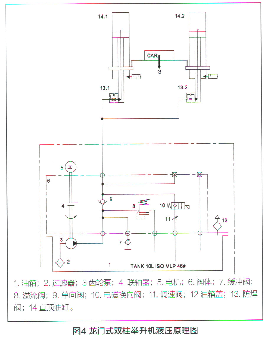 雙柱底板式舉升機(jī)和龍門式舉升機(jī)所用液壓動力單元結(jié)構(gòu)相似,其液壓原理圖如圖3和圖4所示。在液壓油缸上升過程中,主要由電動機(jī)經(jīng)聯(lián)軸節(jié)帶動齒輪泵經(jīng)單向閥向系統(tǒng)輸出高壓油,其輸出壓力由溢流閥設(shè)定,可見只有
