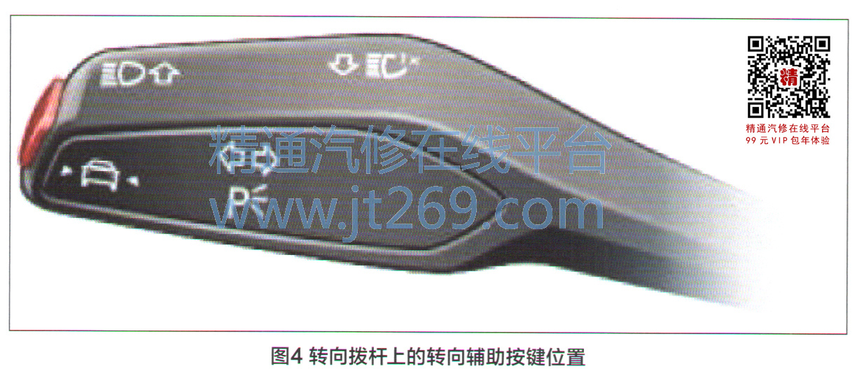 位于轉(zhuǎn)向撥桿上的轉(zhuǎn)向輔助按鍵是接通和關(guān)閉車輛橫向引導(dǎo)的更高一級的“開關(guān)”,該按鍵位于轉(zhuǎn)向撥桿的立面上(圖4)。根據(jù)狀態(tài),該按鍵會激活車道偏離警告和自適應(yīng)駕駛輔助的車道引導(dǎo)功能或者是關(guān)閉這兩個系統(tǒng)。但是,是否能激活車道引導(dǎo)功能,還取決于在自適應(yīng)駕駛輔助的MMI菜單上的車道引導(dǎo)處于“接通”還是 “關(guān)閉”狀態(tài)。在設(shè)置中可以關(guān)閉車道引導(dǎo)(與車道偏離警告無關(guān))。關(guān)閉了車道引導(dǎo)功能,其結(jié)果就會是自適應(yīng)駕駛輔助工作時,只對車輛進(jìn)行縱向調(diào)節(jié),但不會進(jìn)行橫向干預(yù)了。