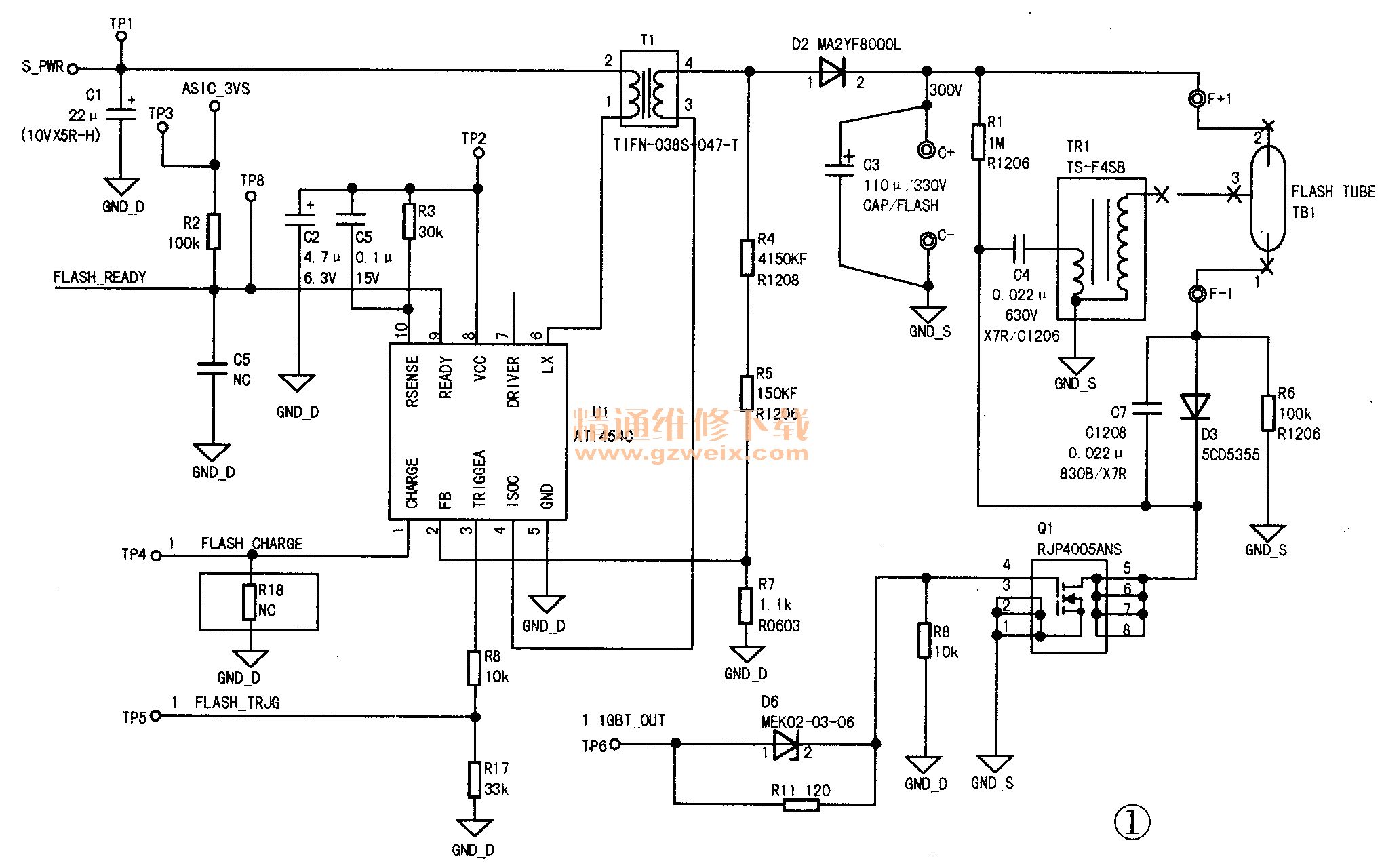 閃光燈工作原理:電路工作時,電路通過TP4向IC塊輸入充電信號flash charge到①腳,IC工作,變壓器T1的次級感應(yīng)出電壓經(jīng)過D2整流后形成300V的電壓,給主電容C3充電a由電阻R4, R5, R7組成的分壓電路向IC的②腳提供充電電壓檢測信號,當(dāng)②腳的電壓接近1.09V時,IC充電電路停止工作。此時IC的⑨腳輸出充電完畢信號,相機(jī)的閃光攝影充電指示燈由周期性閃亮轉(zhuǎn)變?yōu)槌A粒瑫r該信號輸送到相機(jī)CPU,告知CPU可以解除快門釋放控制進(jìn)行拍攝操作了。當(dāng)需要進(jìn)行閃光拍攝時,相機(jī)的CPU發(fā)出閃光觸發(fā)指令,從TP5出來經(jīng)過電阻R17,R18組成的電路輸入到IC的③腳,經(jīng)過IC處理后從⑦腳輸出觸發(fā)信號,該觸發(fā)信號經(jīng)過R11和D8加至場效應(yīng)Q,使Q1導(dǎo)通,觸發(fā)電容C4上的電荷通過Q1和觸發(fā)線圈TR1的初級形成回路釋放,在觸發(fā)線圈的次級感應(yīng)出高電壓將燈管激活。燈管被激活后,主電容C3的電荷通過燈管、D3,Q1形成回路釋放。當(dāng)需要燈管進(jìn)行頻閃發(fā)光時,相機(jī)的CPU發(fā)出脈沖觸發(fā)信號,場效應(yīng)管Q1間歇導(dǎo)通,電路間歇觸發(fā),燈管間歇閃光。