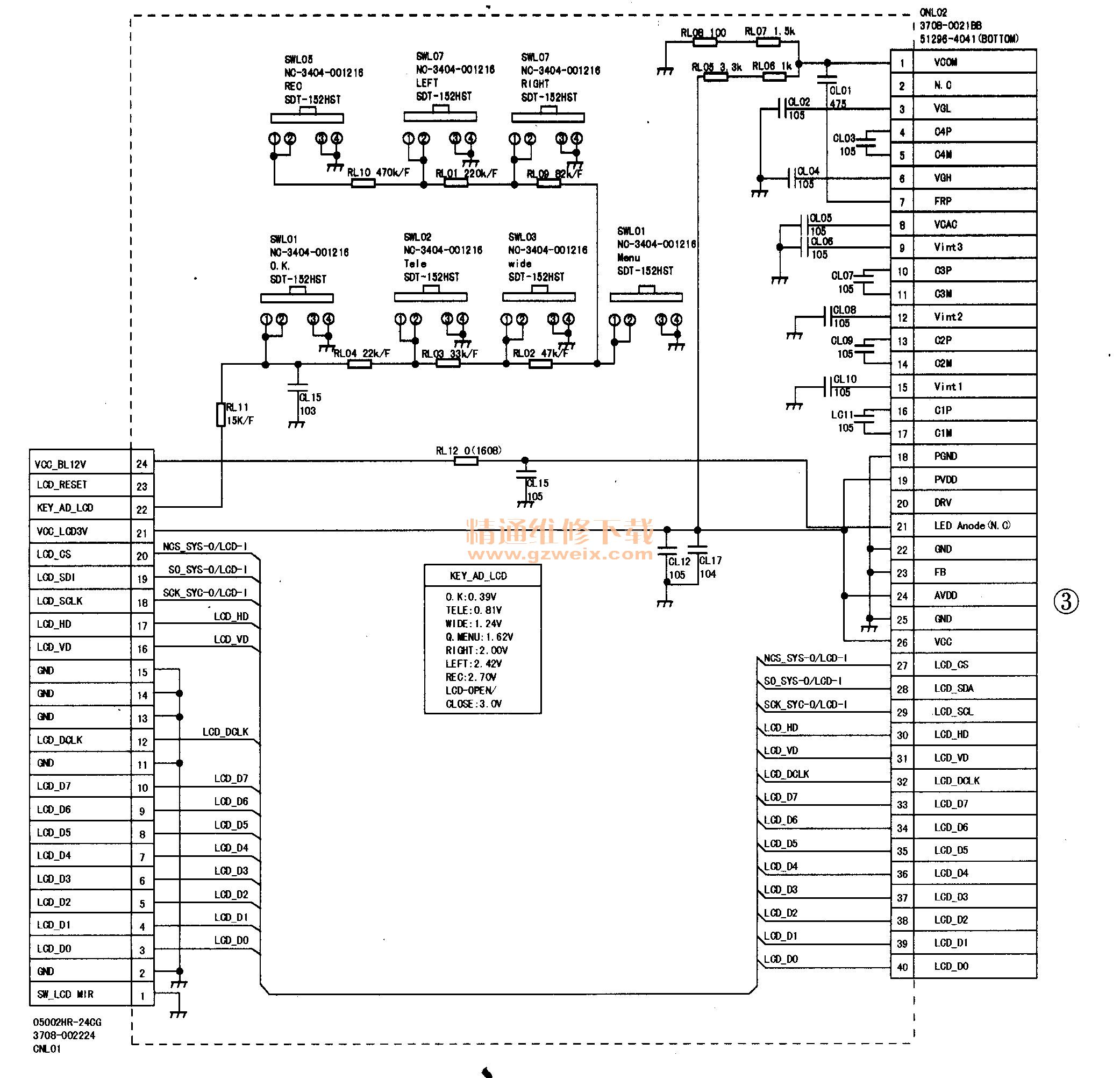 首先檢查CNLO1的21與24腳是否有正常的3V /13V電壓,如電壓異常應(yīng)檢查FPC-LCD與CNS21的12與24腳副板電壓是否正常,檢查Q906 , Q918 , IC901的36腳,如CNLO1的21與24腳電壓測得正常(電路見圖3所示),需繼續(xù)檢查CNLO1的③~12腳是否有正常的收入信號,如信號異常應(yīng)檢查FPC -LCD及CNS21的②~11腳副板波形是否正常,檢查CN1的②~11腳主板波形是否正常,檢查ICLO1的輸出RL08-RL16波形即可判斷出故障。如CNL01的③~12腳收入的信號正常則需檢查液晶顯示器控制的串行端CNL01的18~20腳是否正常,如檢查異常需進一步檢查CNS21的18~20腳副板波形圖與CNl的17~19腳主板波形圖是否正常。如CNL01的18~20腳均正常,則查CNL02, CNLO3的輸出信號是否正常,如異常說明液晶顯示器FPC的連接有故障或斷路現(xiàn)象,如CNL02, CNLO3的輸出信號正常,說明液晶顯示屏組件損壞,更換液晶顯示屏即可修復(fù)。