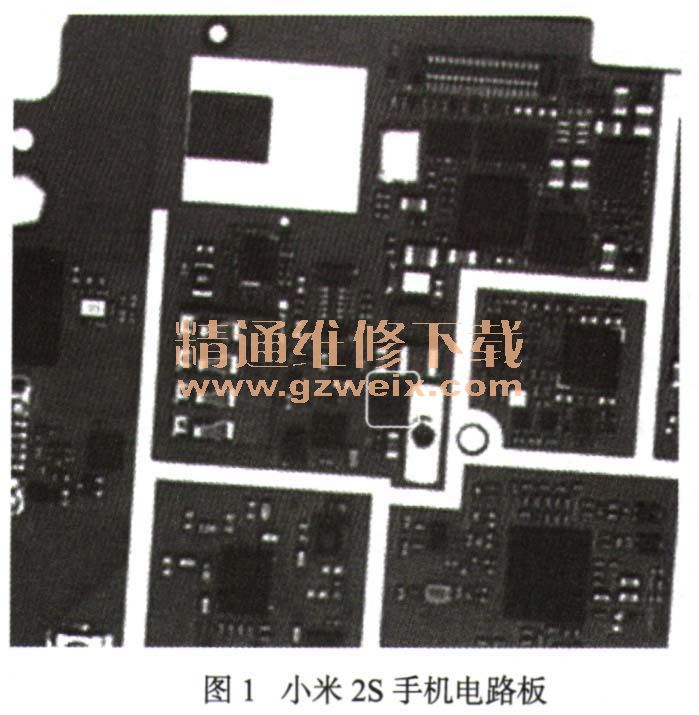 1)拆開(kāi)手機(jī)外殼,然后測(cè)量電池插座附近的元件及電壓,發(fā)現(xiàn)有一個(gè)8腳的充電保護(hù)元件損壞,如圖1所示。