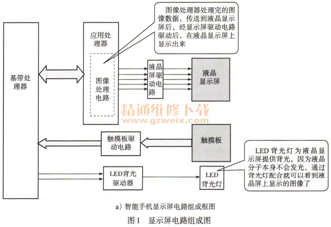 智能手機的顯示屏電路主要由微處理器、圖像處理器、液晶顯示屏、觸摸屏驅(qū)動電路、觸摸板、LED背光驅(qū)動器、LED背光燈等組成,如圖1所示。