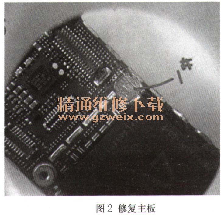3)拆下主板,焊下螺絲柱,然后將主板線路加焊后,重新將螺絲柱焊回,并將主板安裝好(注意不要擰得過緊)。然后開機測試,故障排除,如圖2所示。