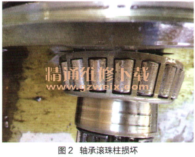 拆檢回轉(zhuǎn)馬達(dá)在拆解回轉(zhuǎn)馬達(dá)之前,先拆卸回油過濾器,沒有發(fā)現(xiàn)金屬粉末等異常污物。然后拆解回轉(zhuǎn)馬達(dá),檢查柱塞的滑靴、回程盤、配流盤和缸體等沒有明顯磨損。檢查制動(dòng)活塞、摩擦片、制動(dòng)彈簧沒有明顯損壞現(xiàn)象。當(dāng)拆出回轉(zhuǎn)馬達(dá)主軸時(shí),發(fā)現(xiàn)主軸滾柱軸承的滾柱表面磨損嚴(yán)重,已呈現(xiàn)麻點(diǎn)狀,如圖2所示。